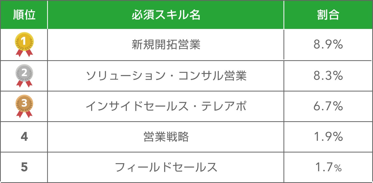 SOKUDAN(https://sokudan.work/)に掲載された営業の案件で、必須スキル項目に入力されたスキル名から上位5つを記載しております。