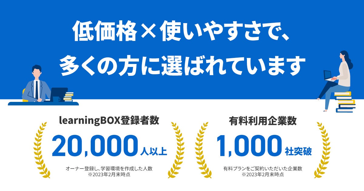 2016年のサービス開始よりlearningBOXは、低価格で使いやすいeラーニングシステムとしてさまざまな業界・業種のみなさまにご愛用いただいています。2023年2月末日時点で、累計登録者数が20,000名、有料利用企業数は1,000社を突破いたしました。