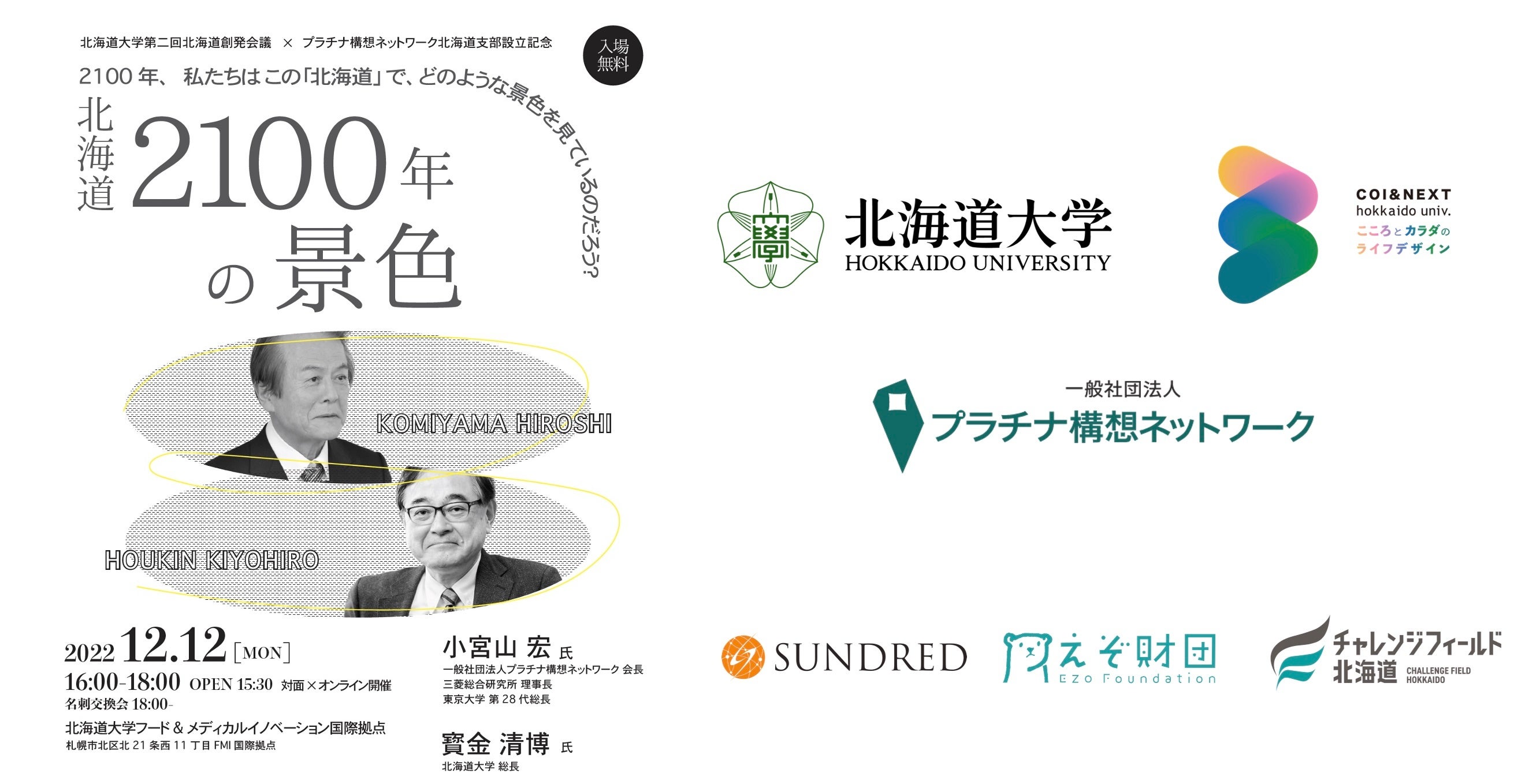 北海道の次の100年に向け、「北海道2100年の景色」をテーマに、vision「プラチナ社会=地球が持続し、豊かで、すべての人の自己実現を可能にする社会」を掲げ活動するプラチナ構想ネットワークの小宮山 宏氏と、“「光」は「北」から、「北」から「世界」へ”をスローガンに、社会と歩む卓越大学「Accessible Excellence」を目指し活動する北海道大学総長の寳金 清博氏が対談します。共に、“北海道の未来の景色”、“私たちのWell-being”、“私たちの幸せ” についてゆっくり考えましょう。