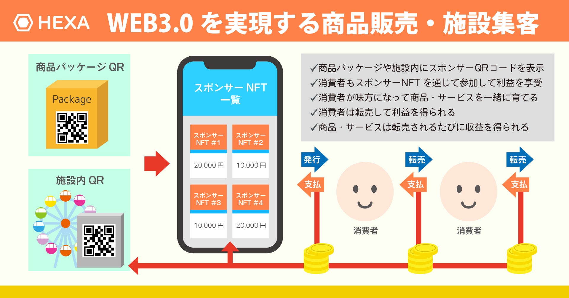 消費者がスポンサーNFTを保有すると、店舗や商品などのスポンサーNFTを示すQRコードからアクセスできるスポンサーページで名前とツイッターアカウントのリンク(任意)を掲載することができます。また、NFTはHEXA内でいつでも転売可能で、転売するたびに転売額の最大10%が発行者に還元されます。