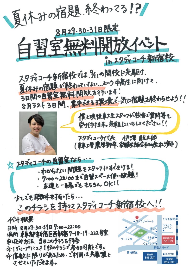 8月29日・30日・31日の3日間限定で、スタディコーチ新宿校自習室無料開放イベントを実施いたします。