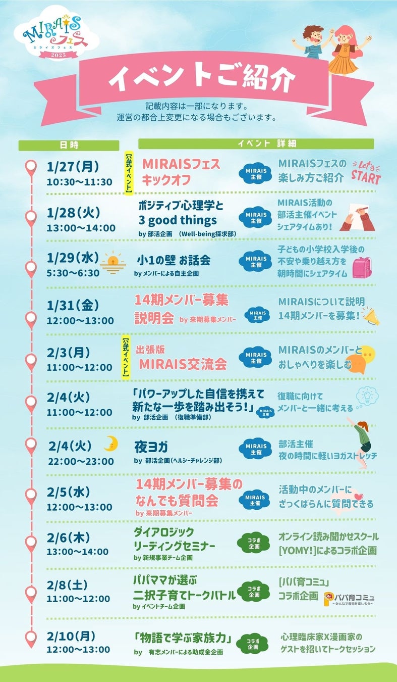 育休コミュニティ「MIRAIS(ミライズ)」(代表 栗林真由美、以下MIRAIS)は、2025年1月27日(月)~2月10日(月)、コミュニティ体験イベントMIRAISフェスを開催いたします。