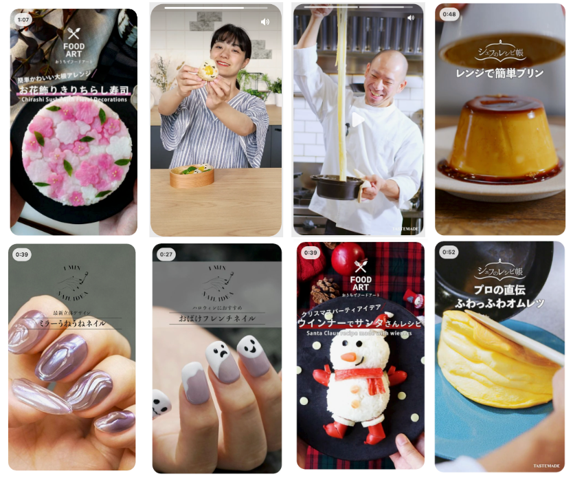 日本においてもシェフが自宅ですぐに試せるプロの技を紹介する「シェフのレシピ帳」、TastemadeJapanのフードクリエイター が簡単に作れる可愛いレシピを魅せる「おうちでフードアート」、さまざまなシーンにピッタリなネイルアイデアを紹介する「1分ネイルアイデアシリーズ」の3つのシリーズをPinterestのみで限定配信中。
