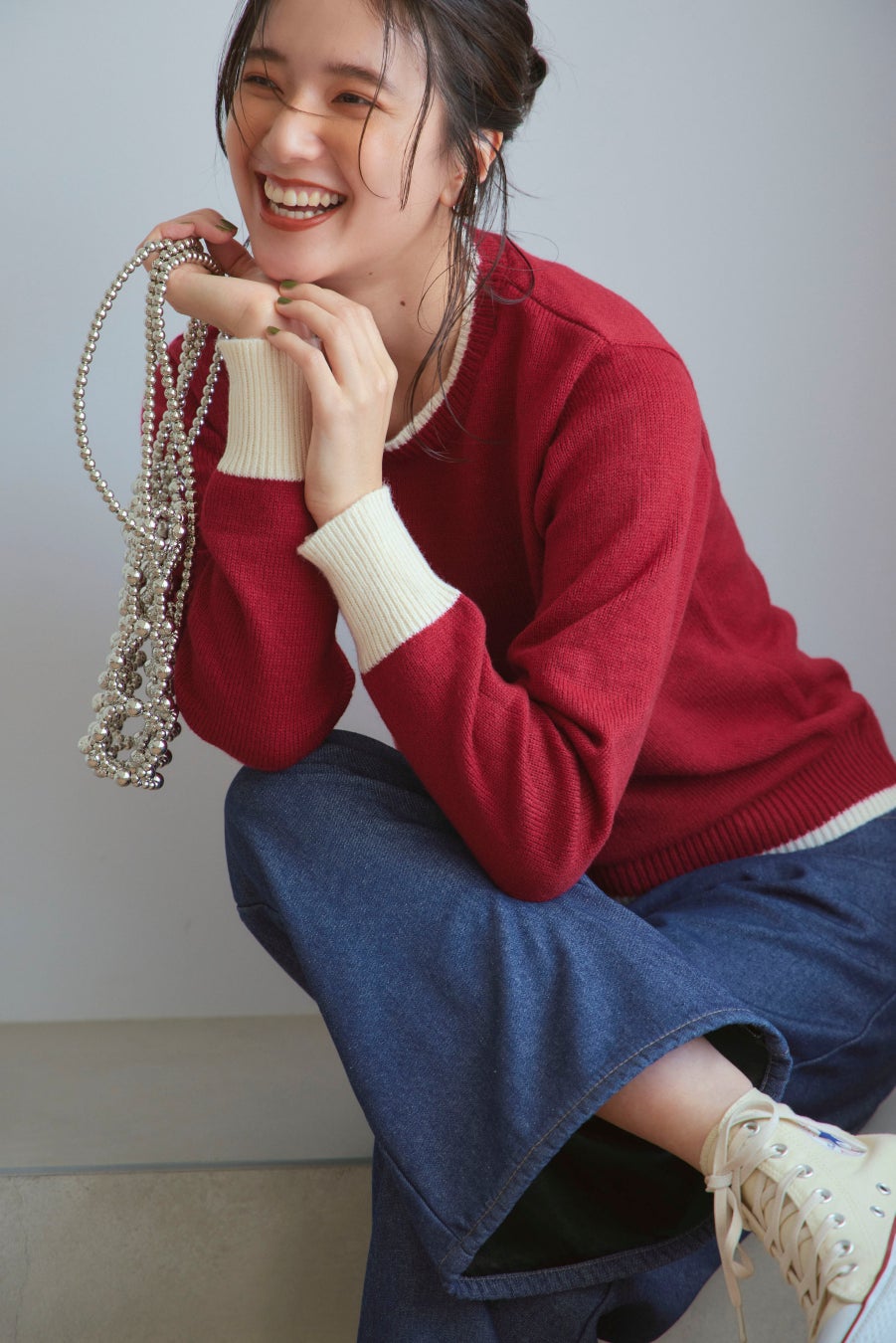 配色デザインがポイントになるニットトップスは、程よい厚みで着心地の良い、ポリエステル糸を使った柔らかな肌触りの天竺編みニットです。寒い季節に活躍する、暖かみのある素材感。