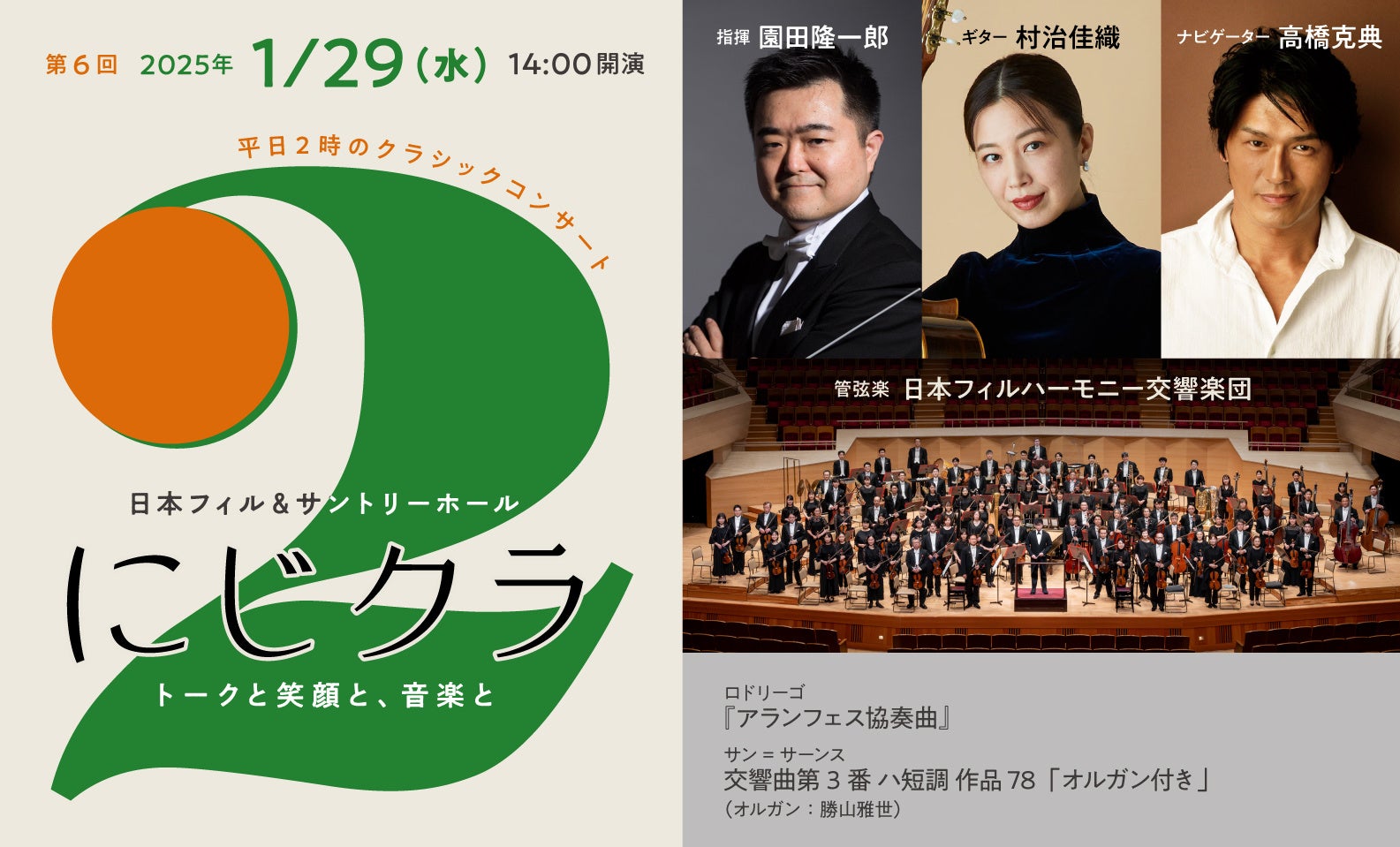 平日2時のクラシックコンサート「にじクラ」は、親しみやすいトークと共に、上質な演奏で名曲をお楽しみいただく、マチネシリーズです。シリーズの顔となるナビゲーターとして音楽全般に幅広い関心を持つ俳優の高橋克典が出演し、人気・実力共に兼ね備えた指揮者・ソリストとのトークが好評です。第6回の指揮者は、オペラと管弦楽の両分野で国際的に活躍する園田隆一郎、そしてソリストは、2023年にデビュー30周年を迎えた村治佳織(ギター)が登場。ギターとオーケストラの協奏曲の傑作、ロドリーゴ作曲『アランフェス協奏曲』を披露します。後半はサントリーホールが誇る世界最大級のオルガンも印象的に登場するサン゠サーンス作曲 交響曲第3番 ハ短調 作品78「オルガン付き」(オルガン:勝山雅世)をお届けします。また開場中の13:40からはオルガニスト勝山雅世による約10分間のオルガン・プレコンサートを開催します。