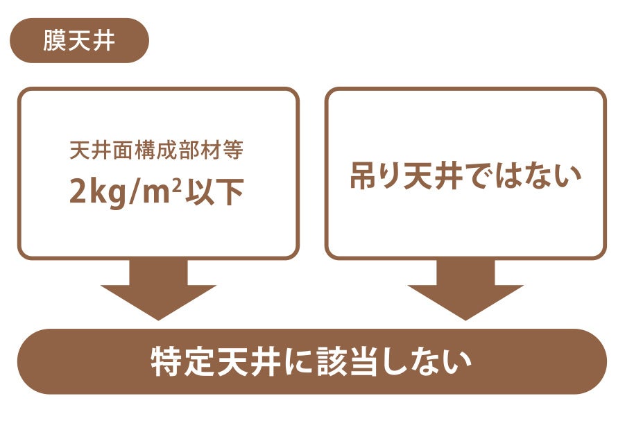 膜天井は、「脱落によって重大な危害を生ずる恐れがある」とされる「特定天井」(国土交通省告示771号、平成25年8月)ではありません。