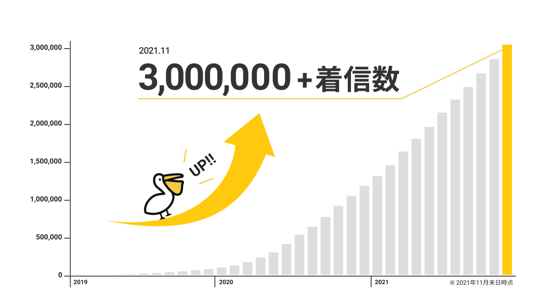 ユーザーの増加に伴い、1日あたりの受電数も伸長しており、2021年11月24日には累計着信件数が300万件を突破いたしました。2021年6月の累計着信件数200万件突破からわずか半年のことであり、「fondesk」の提供するサービスが、ユーザーの業務効率化はもとより、日本企業のDX推進の一助を担っていることがいえるようです