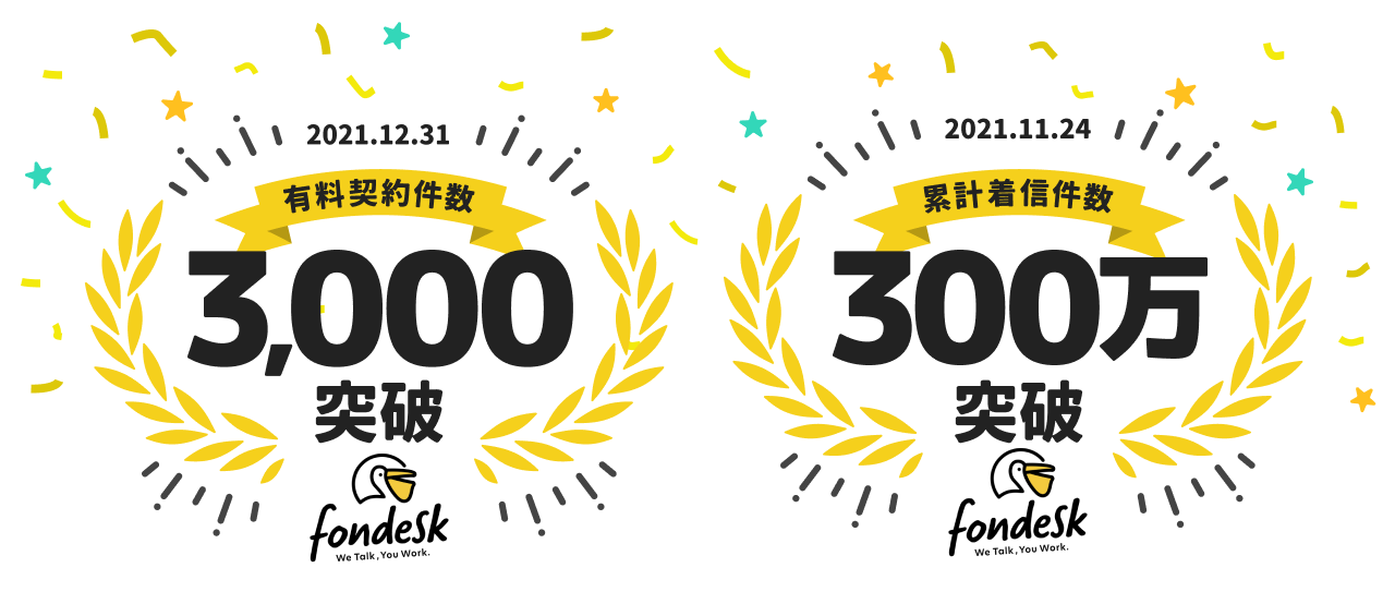 「fondesk」は、オフィスにかかってくる電話の対応を代行し、受けた電話内容をチャット(Slack・Chatwork・Microsoft Teams・LINE・LINE WORKS・Google Chat)やメールで報告するサービスです。2019年2月18日のサービス開始以降、「電話対応をなくしてコア業務に集中できる職場にしたい」「受電漏れを防ぎたい」といった企業からご好評をいただいております。 そしてこの度、2021年12月末時点で、「fondesk」の有料契約件数が3,000件を突破いたしました。ハイブリッド型勤務の試行など、テレワークと並行しながらオフィスへの出社も再開するビジネスパーソンが増えている中、「fondesk」の活用をテレワークの推進に留まらず、本来のオフィスでの業務効率化を目的に導入する企業が増えており、有料契約件数も前年同月比163%の成長となりました。