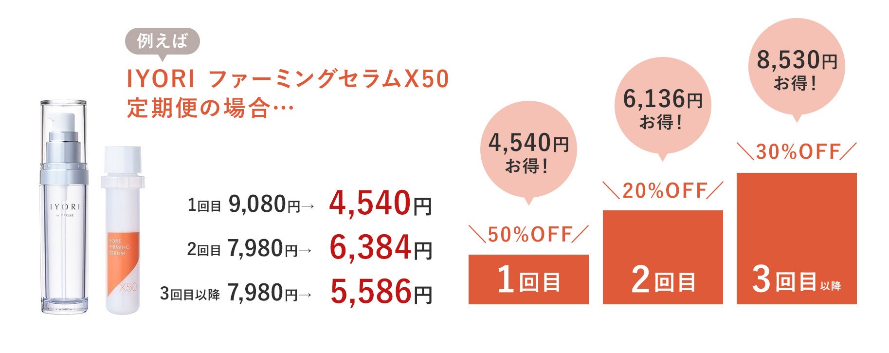 初回50%OFF、2回目20%OFF、3回目以降30%OFFでお届けいたします。