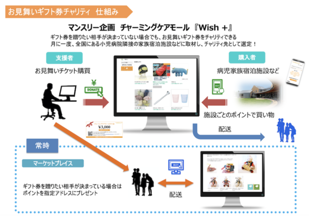 病気や障害のある子どもたちや家族が過ごす施設などへのチャリティ専用お見舞いギフト券を一般応援者に購入いただき、購入金額分のポイントを対象施設にチャリティすることができ、ご購入いただいた方にもチャリティリターンが届くという仕組みになっています。(ポイントはチャーミングケアモール内でのみ活用可能となります。ポイント活用期間には期限があります。)
