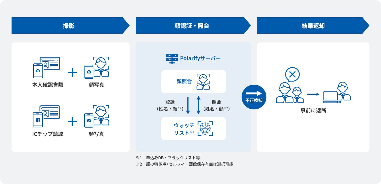 顔の使いまわし検知とは、事業者様から顔情報の提出を受けた際、Polarifyに保管されている顔情報(過去の申込みにてユーザーが撮影したセルフィー画像や、取引制限先に指定しているユーザーの顔情報等)と照合し、一致/不一致の結果を返却するサービスです。