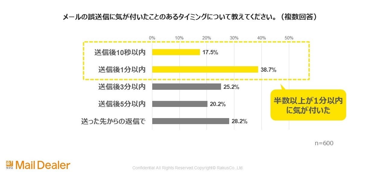 自身のメールの誤送信に気が付いたタイミングは、「送信後10秒以内」が17.5%、「送信後1分以内」が38.7%と、半数以上がメール送信直後に気が付いた経験があるとわかりました。