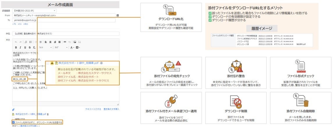 ファイルを添付せずにダウンロードURL化して送信することが可能です。ダウンロードURL化することで、万が一誤ったファイルを送信してしまった場合でも、ファイルを削除し情報漏えいを防ぐことができます。