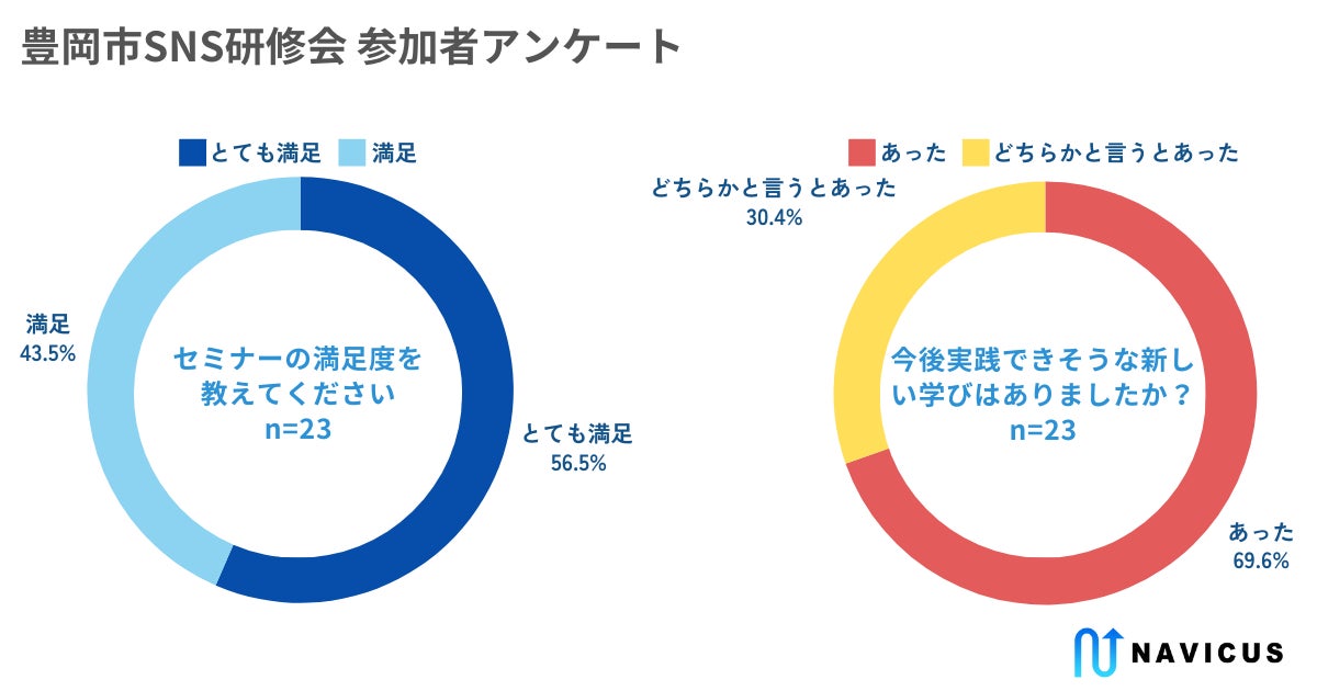 研修会実施後、参加者にアンケートを行いました。セミナーの満足度を問う質問では、56.5%が「とても満足」、43.5%が「満足」と回答し、「どちらでもない」ほか不満の声は0%となっています。また、「今後実践できそうな新しい学びはありましたか?」という質問に対しても、69.6%が「あった」、30.4%が「どちらかと言うとあった」と回答しています。