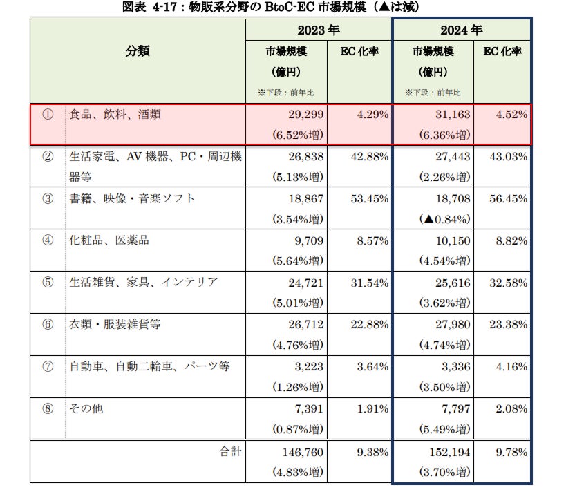 近年の食品EC市場は驚くべき成長を遂げています。経済産業省の調査によると、物販系分野の商品毎のEC市場規模において、食品EC市場が最大の割合を占めており、2024年にはその市場規模は3兆円にも達しています。