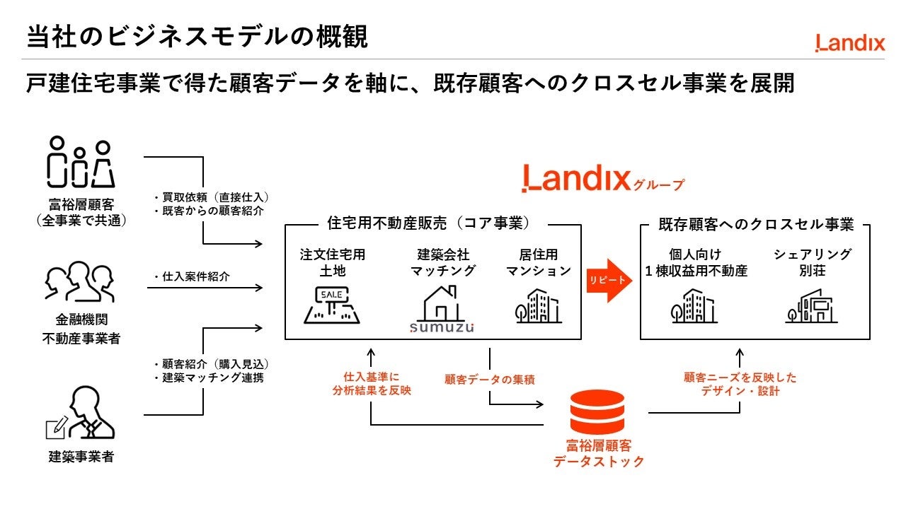 ランディックスグループは、富裕層顧客を対象に不動産領域のワンストップサービスを展開しています。主力事業は戸建住宅の販売であり、全成約の30%程度が紹介・リピート取引によって構成されています。注文住宅希望者への建築会社マッチング(sumuzu Matching)や、リピート取引となるお客様に向けた1棟収益用不動産の販売など、時代と共に変化するお客様のニーズに応え、「パーソナライズ」をキーワードに事業展開を行っています。