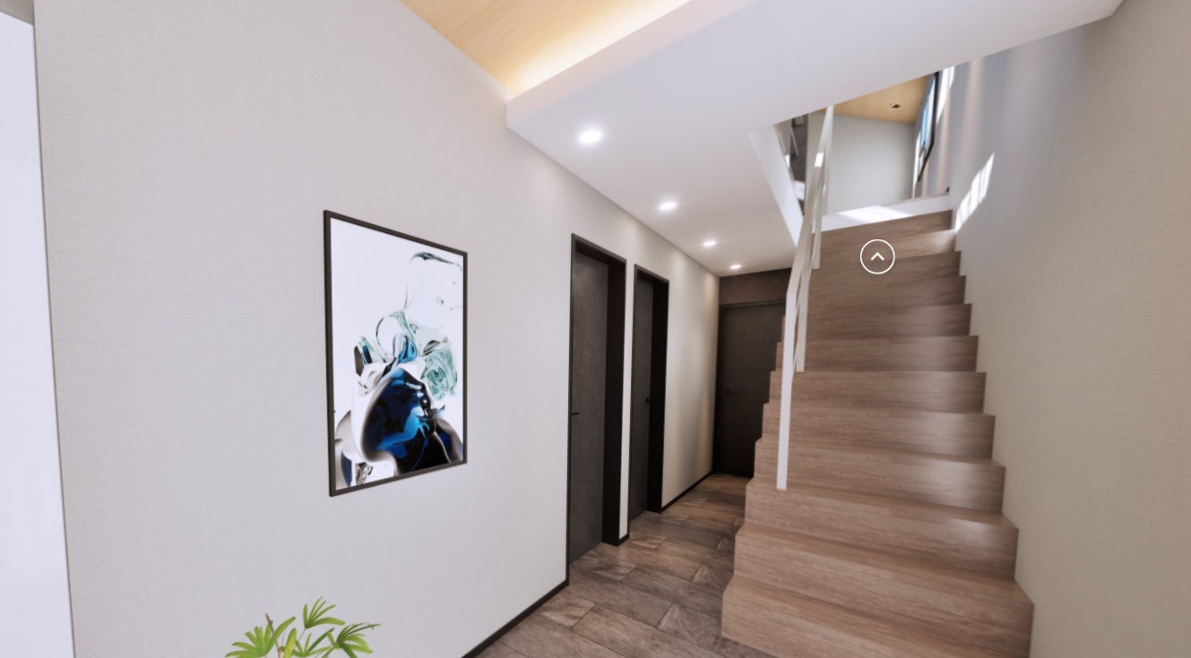 ゆったりとした玄関からの導線。ダウンライトや間接照明、床材の質感まで細かく表現しています。