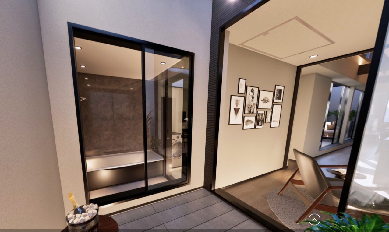 本物件の大きな特徴であるひとつなぎのリビング~洋間~両面テラス。40畳にもなる空間が最高の解放感を実現しており、かつバスルームからテラスにもリビングにも出られる設計。住み心地の良い生活導線になっています。テラスに簡易サウナセットを置くこともおススメ。サブのバルコニーがあるため、来客時に洗濯物を見せないのも〇。
