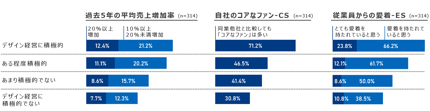 デザイン経営のビジネスへの影響を確認するため、ビジネス成果指標として、財務の観点から「(過去5年の平均)売上増加率」、売上成長の基盤となりうる非財務指標として、顧客満足(CS)の観点から「自社のコアなファン」、CSのベースとなる従業員満足(ES)の観点から「従業員からの愛着」を設定し、セグメント間で比較しました。