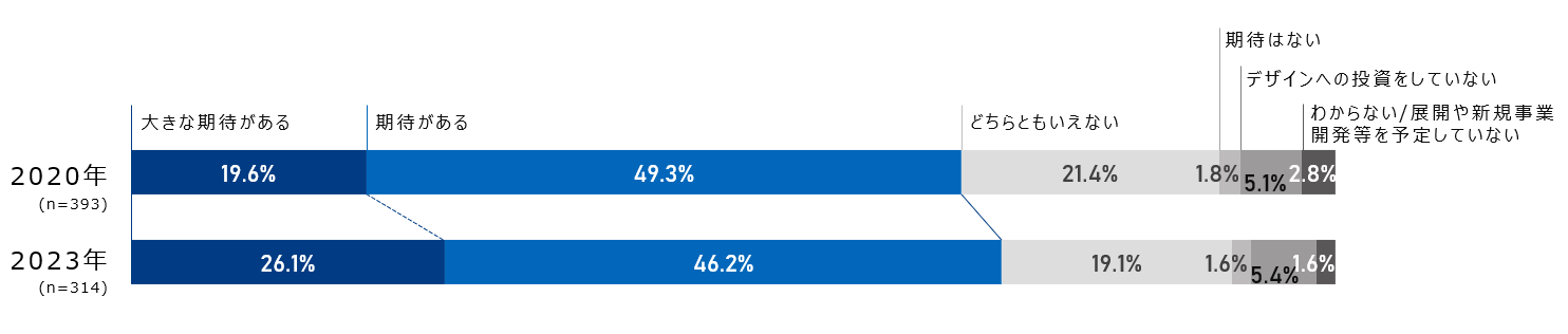 また、デザインへの投資に対する将来的な期待についても、「大きな期待がある」とする企業の割合が増加しました。