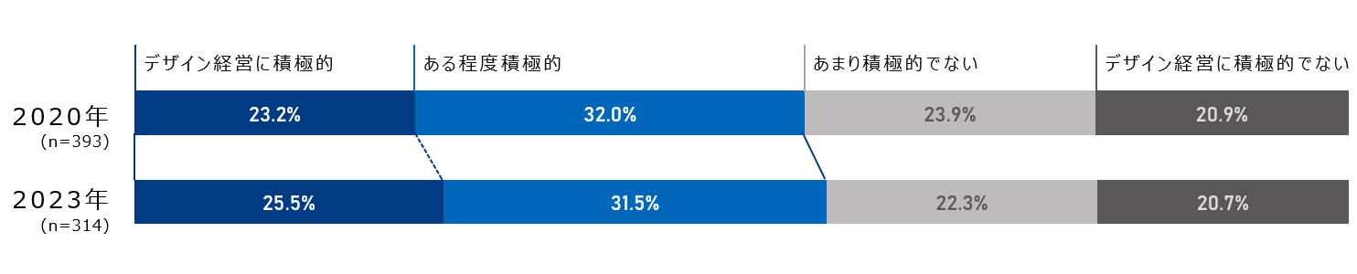2020年調査と同じ配点基準により4つのセグメントの構成比を比較したところ、全体として大きな変化は見られず、3年前と比較してデザイン経営が進展したとはいえない状況であることがわかりました。