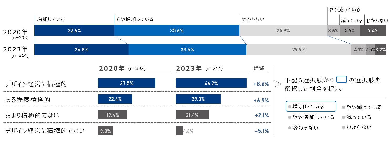 特にデザイン経営に積極的な企業ほど「増加している」とする割合が増えた点は、注目すべき変化といえます。