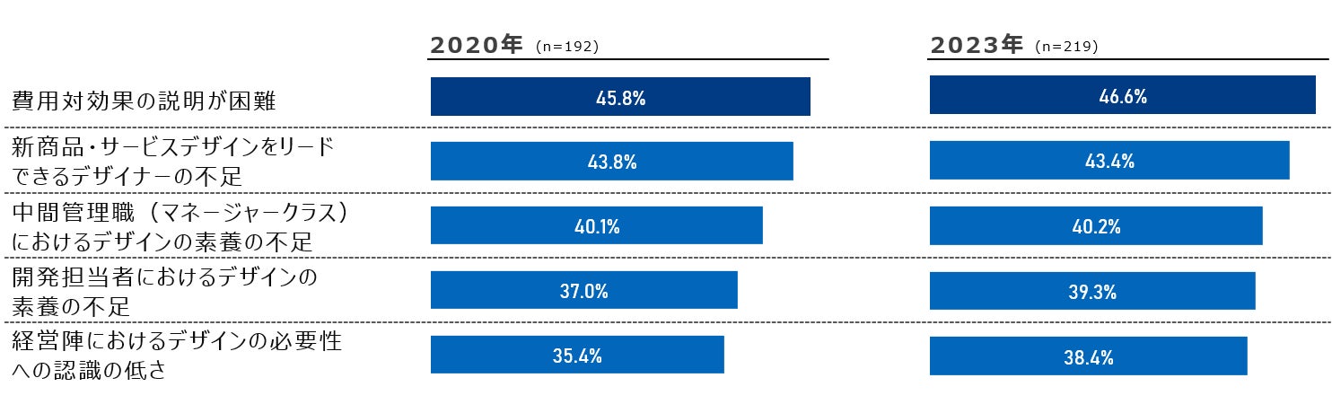 デザイン経営を今後も推進していくと回答した企業の課題として最も多く挙げられたのが「費用対効果の説明が困難」、次点が「新商品・サービスデザインをリードできるデザイナーの不足」で、2020年調査と同様の順位となりました。続く課題についても2020年調査と同じ順位、同水準の回答率となっており、3年を経てもデザイン経営推進を取り巻く課題状況は変わっていないことが明らかとなりました。