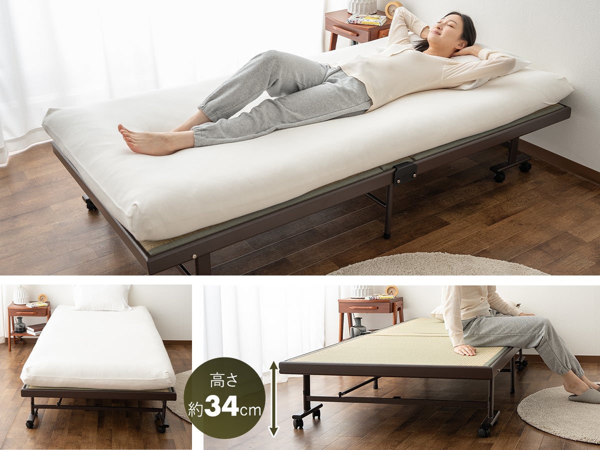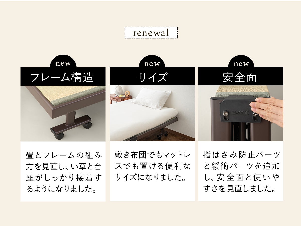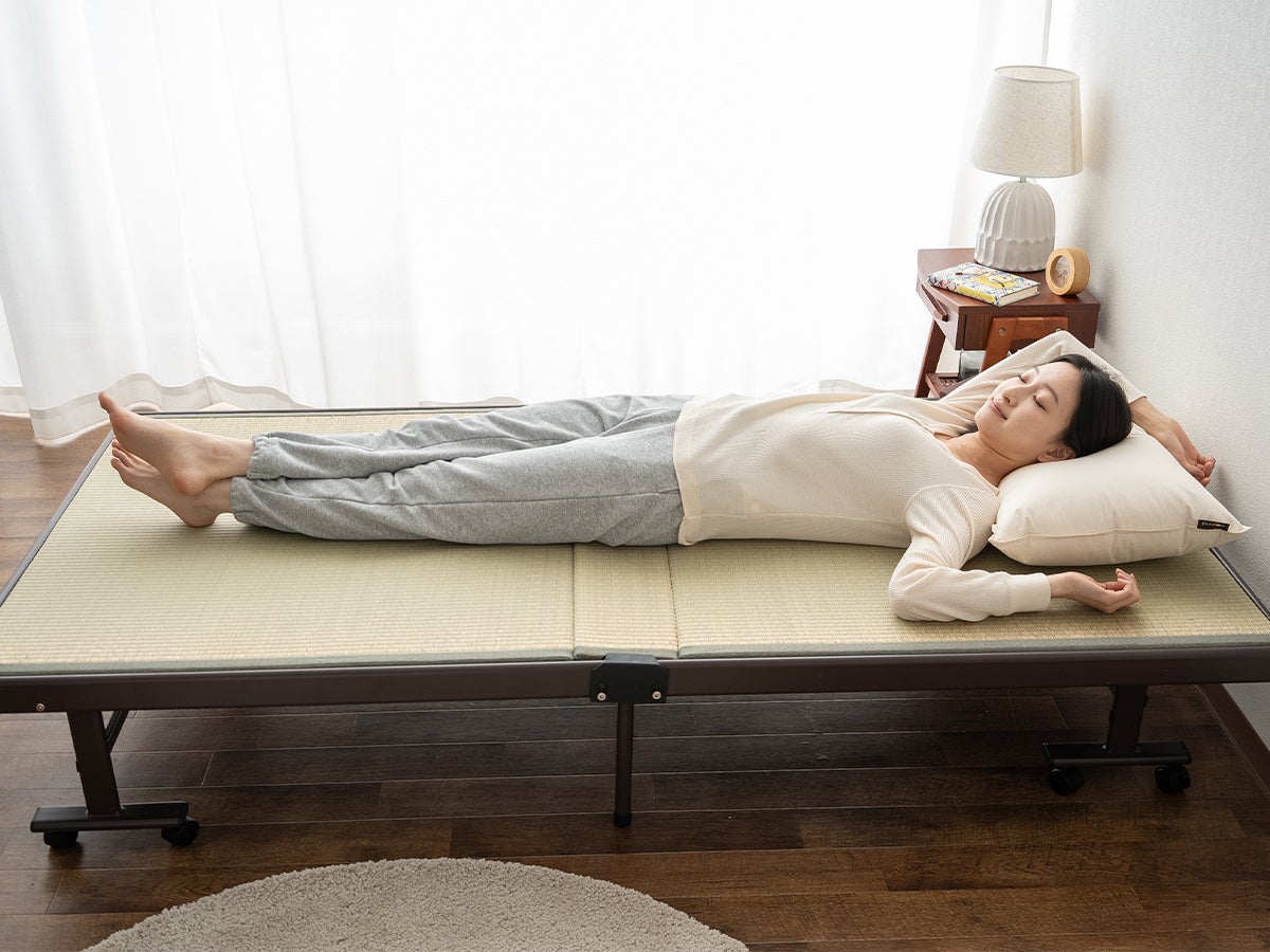 寝室ブランドEMOOR(エムール)から、天然い草を使用した折りたたみベッドが、フレーム構造やサイズ、機能を見直してリニューアルして新登場しました。