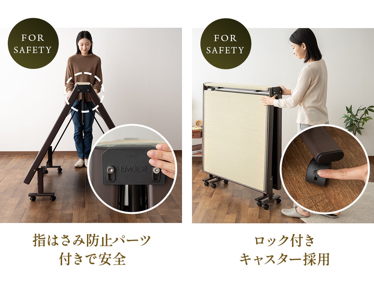 ベッドを開く際に、指をはさむリスクを軽減する、指はさみ防止パーツが付いています。また、8つのキャスターにはロック機能が付いているので寝返りしてもしっかり安定します。
