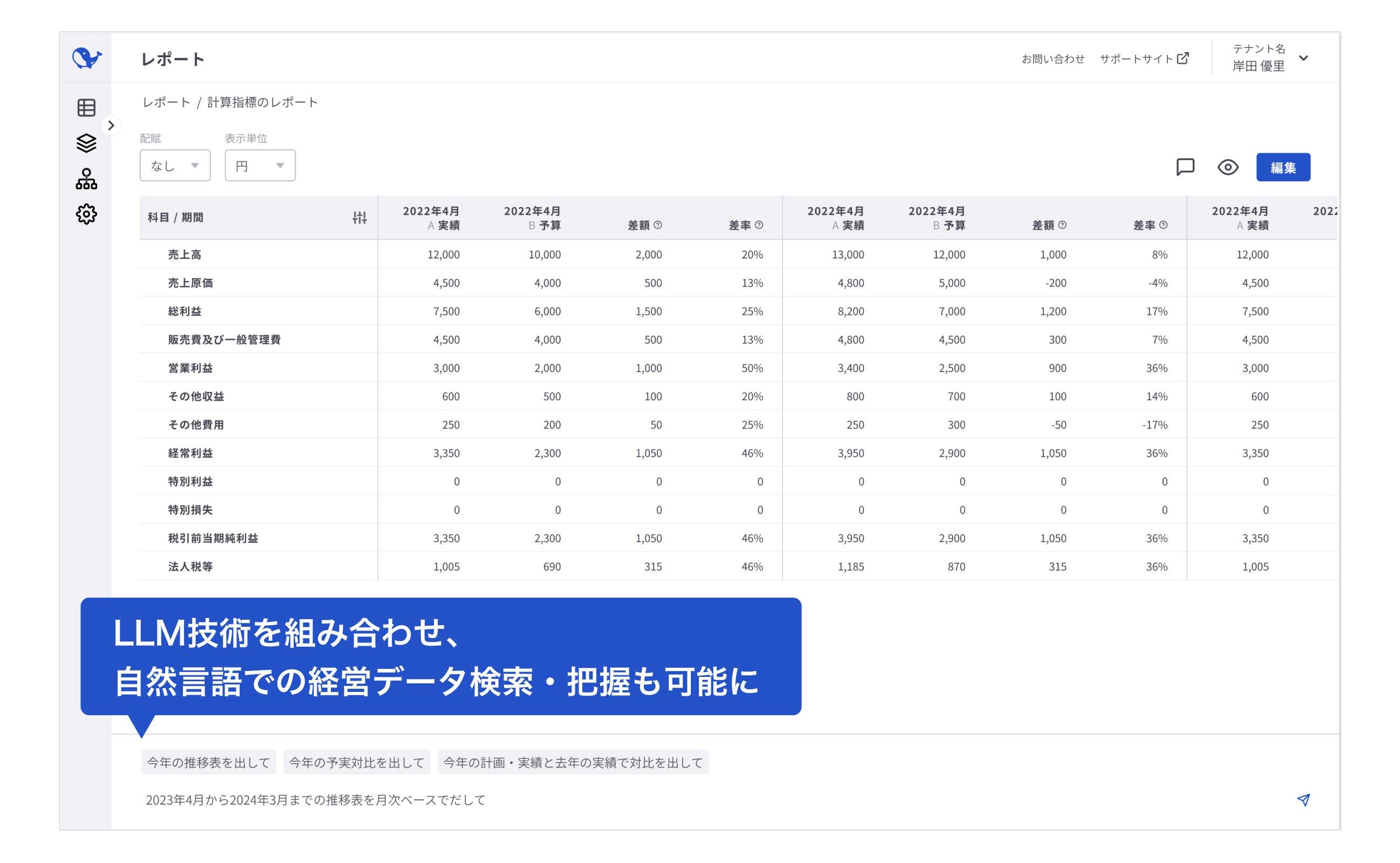 生成AI / LLM技術を組み合わせ、自然言語での経営データ検索・把握も可能に