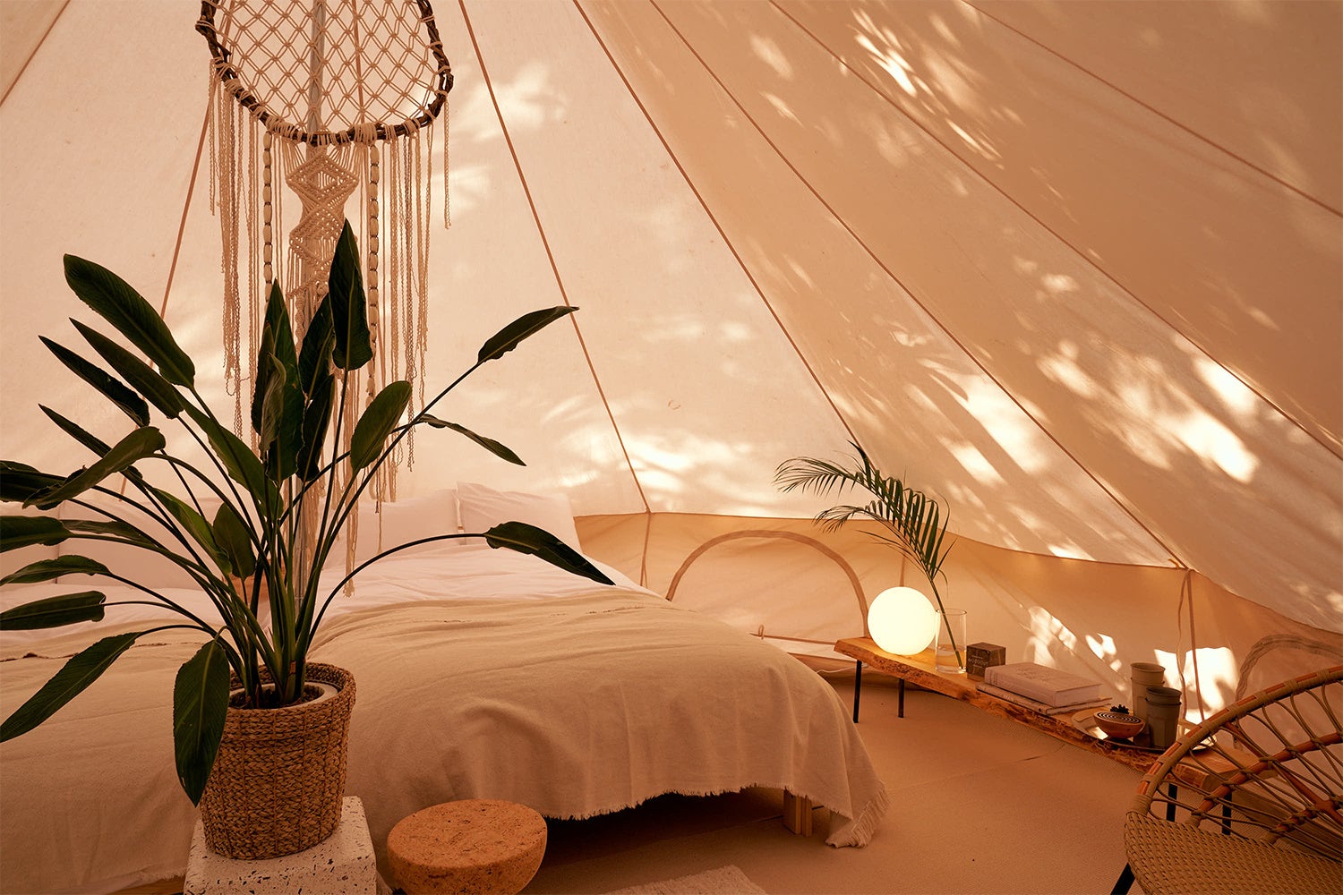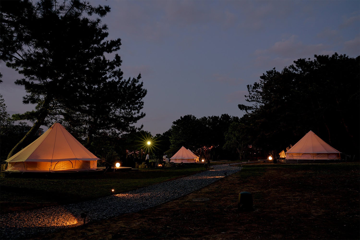 「Glamping Area」には自然をより身近に感じられる、ノルディスク社のグランピングテントをご用意。こだわりのインテリアで装飾されたリビングのような快適な空間。1棟貸切スタイルで冷暖房機能が備わっているので、季節を問わずご家族やお友達とくつろぎの時間をお楽しみいただけます。