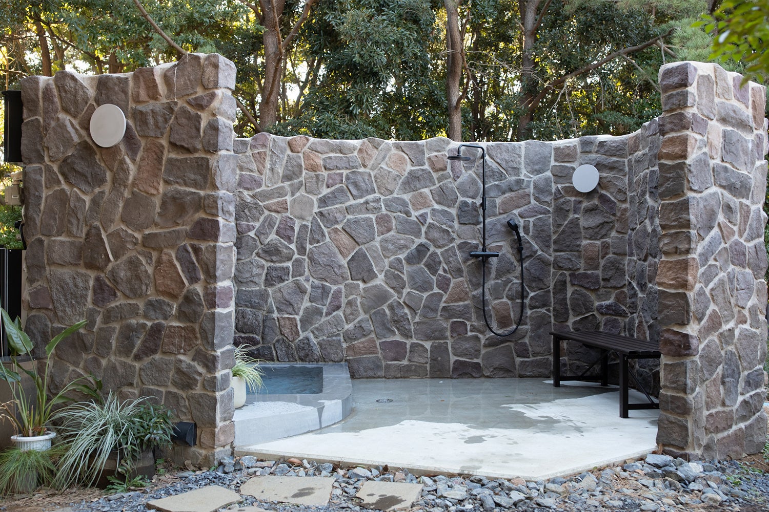 アウトドアバスは石を積み上げて囲った、シンプルでプリミティブなアフリカンテイストで、シャワーと浴槽を兼ね備えたリラックスしながら過ごすことができるスペースです。