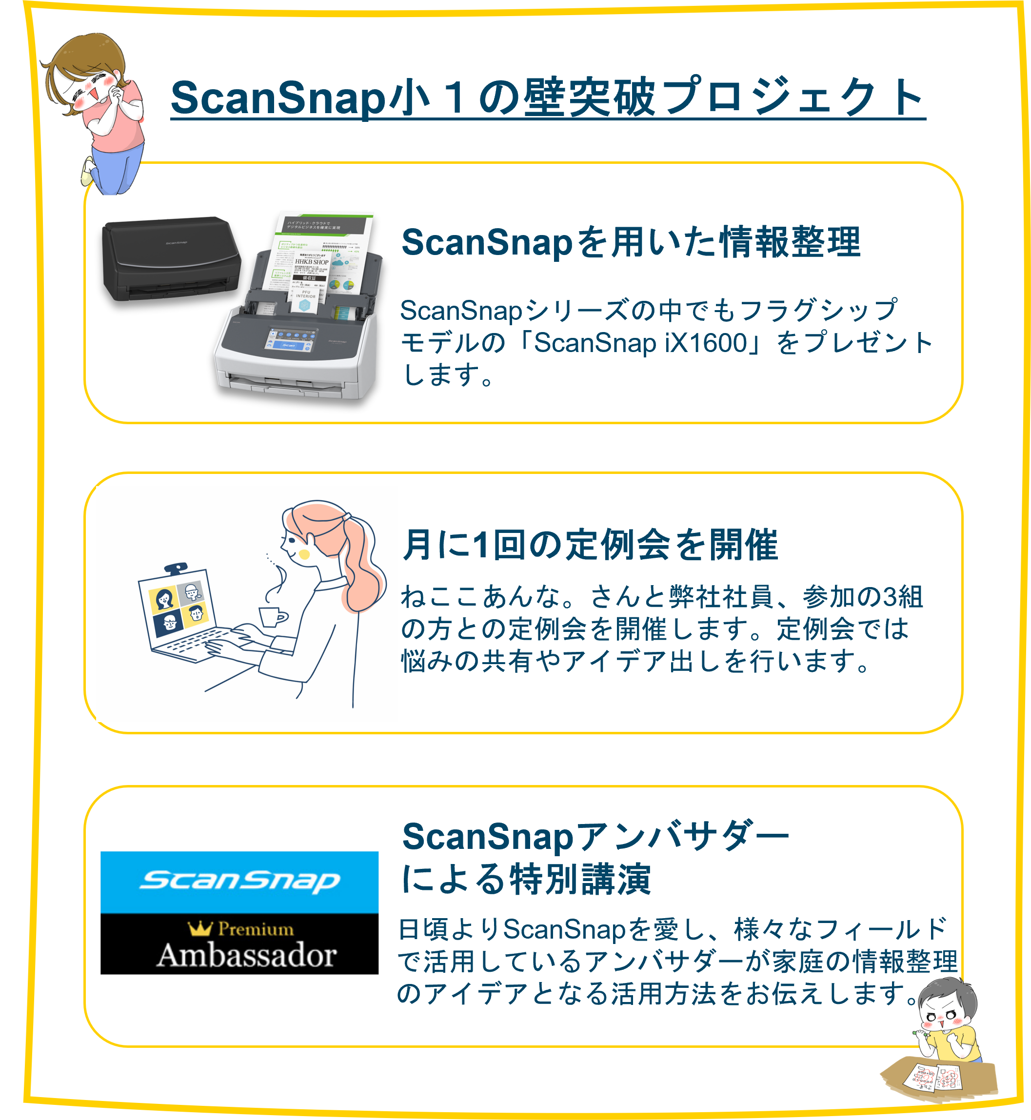 小学1年生のお子様をもつねここあんな。さんのご家庭に2024年3月まで密着し、ScanSnapを用いて「情報やタスクの整理」問題を解決していきます。また、同じように「小1の壁」に悩んでいる方を対象に、ねここあんな。さんと共に「情報やタスクの整理」問題を一緒に解決していく方を3組募集します。