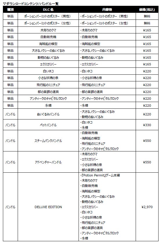 本作には、より深くゲームを楽しみたいユーザー様向けに、ゲーム内で部屋をカスタマイズできるダウンロードコンテンツが盛り沢山!個別での購入だけでなく、ゲーム本編と各種DLCをまとめてお得に購入いただける『Potion Permit:DELUXE EDITION』も同時配信。多種多様なアイテムを駆使して、あなただけのオンリーワンな街・部屋づくりを楽しみましょう!