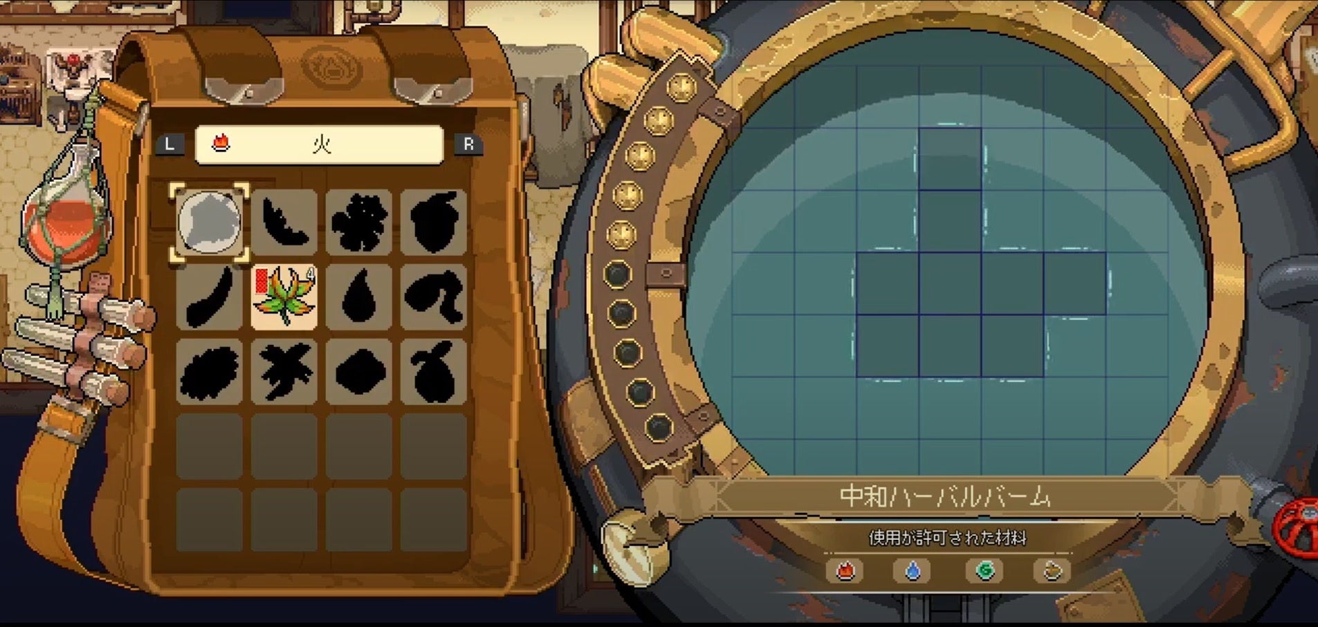 集めた材料は大釜の中で混ぜ合わせ、薬やビタミン剤などを調合・錬金することができます。経験を積めば積むほど、大釜をアップグレードさせることができ、より強い薬を作ることができます。