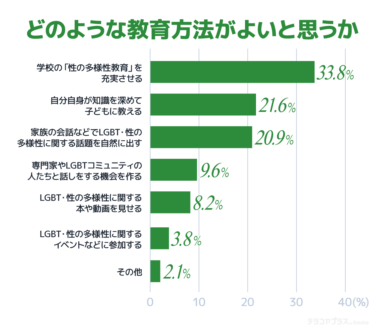 続いて「自分自身が知識を深め、子どもに教える」(21.6%)と「家族の会話などで話題を自然に出す」(20.9%)と答えた保護者が多かったことから、保護者も自ら子どもに伝えることが大切だと感じている様子が伺えます。