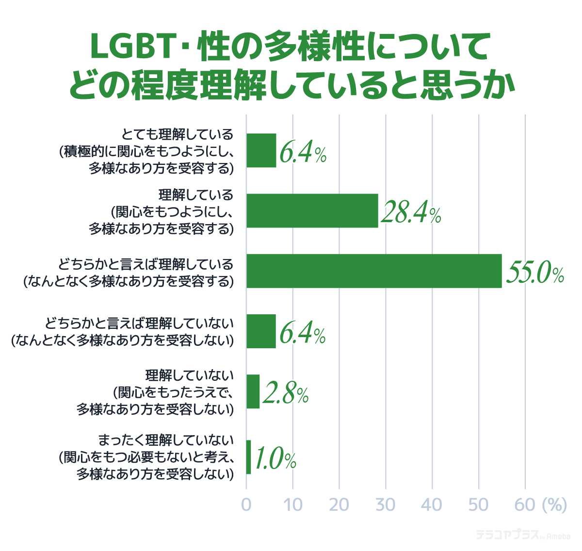 自ら関心をもつようにしているという保護者は、「とても理解している(積極的に関心をもつようにし、多様なあり方を受容する)」6.4%と、「理解している(関心をもつようにし、多様なあり方を受容する)」28.4%をあわせて約3割(34.8%)程度でした。