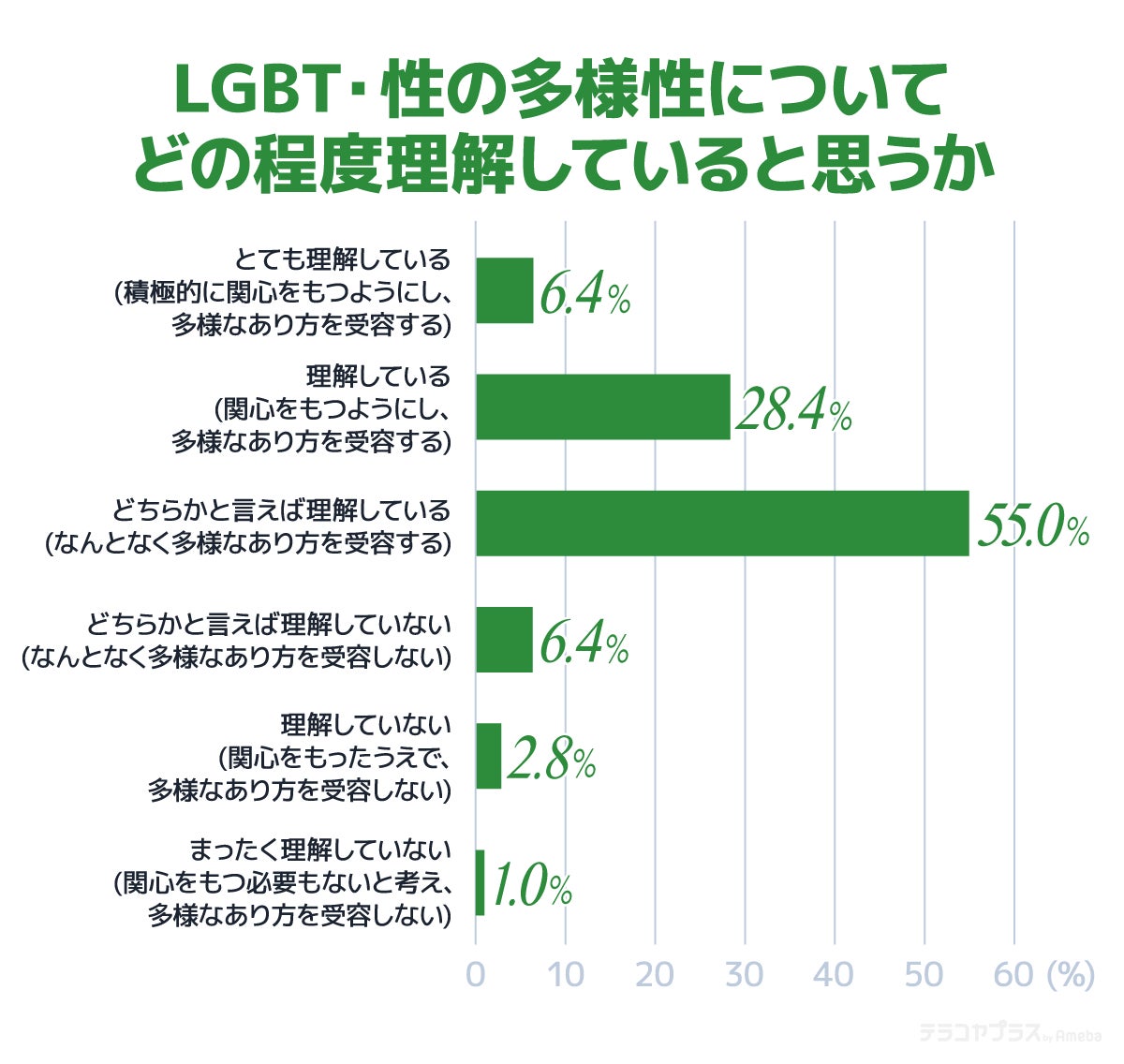 小学生の保護者にLGBT・性の多様性についてどの程度理解していると思うか尋ねたところ「どちらかと言えば理解している(なんとなく多様なあり方を受容する)」がもっとも多く約半数の55.0%でした。