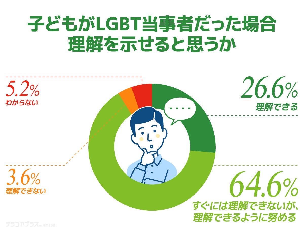 最後に「子どもがLGBT当事者だった場合に理解を示せると思うか」と尋ねたところ「理解できる」が26.6%、「すぐには理解できないが、理解できるように努める」が64.6%となり、合わせて約9割(91.2%)の保護者が、理解したいと考えていることもわかりました。