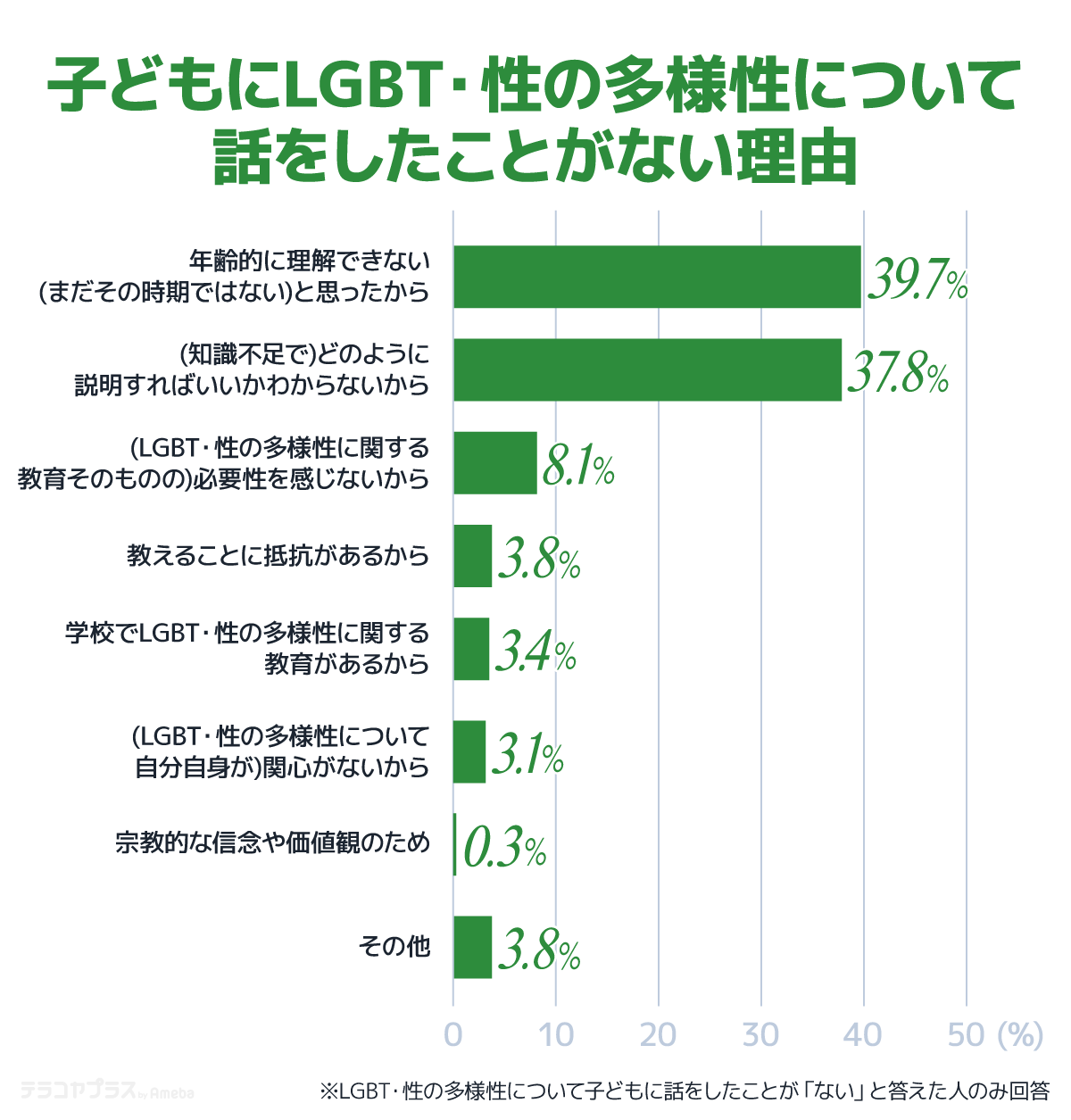 子どもに話をしたことがない理由について尋ねると、もっとも多かったのは「年齢的に理解できない(まだその時期ではない)と思ったから」で39.7%。1.9ポイント差で「(知識不足で)どのように説明すればいいかわからないから」(37.8%)が続きました。