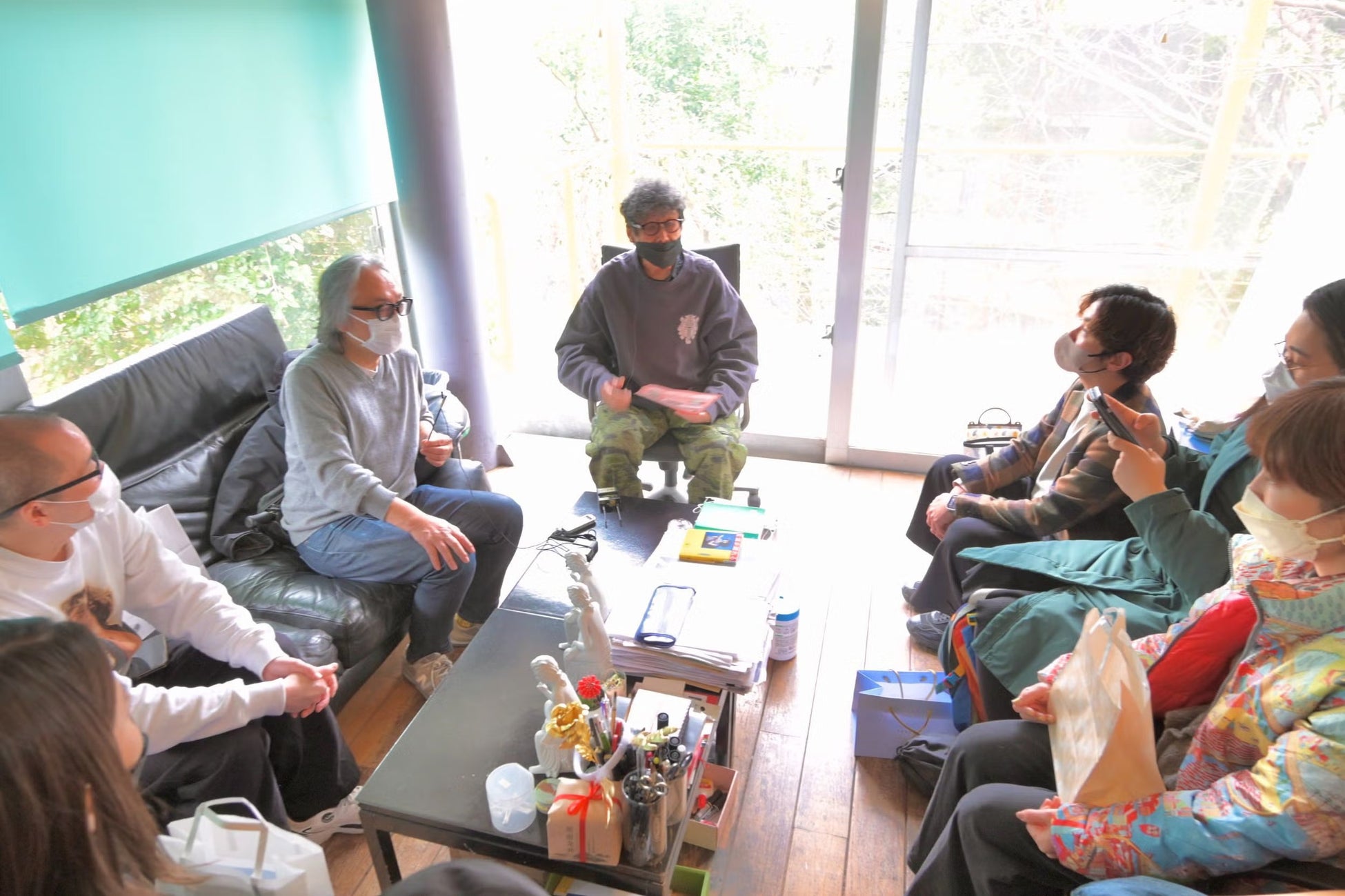 第1回目として、2025年4月26日〜6月22日に世田谷美術館で企画展「横尾忠則 連画の河」を開催される横尾忠則さんのアトリエに「ビジュツヘンシュウブ。」のメンバー10名が鈴木さんと共に訪問しました。