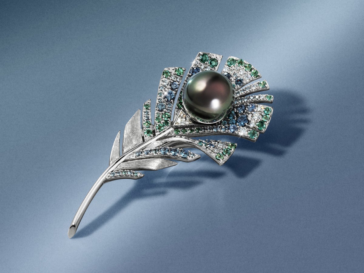 プレミアムラインから登場する「Chromaplumée(クロマプリュメ)」は、高貴で優雅、そして情熱的といった多面的な魅力をもつ「六条御息所」を、孔雀の羽を思わせる色彩で表現した、マルチウェアジュエリー(帯留/ブローチ/ペンダントトップ)。中央に配した黒蝶真珠と、アレキサンドライトやベキリーブルーガーネットといったカラーチェンジストーン(※光源によって色が変化する宝石)が放つ艶やかさに、職人が手作業で彫りを施した部分が生み出すテクスチャーを重ねることで、繊細な光沢のコントラストを描きます。
