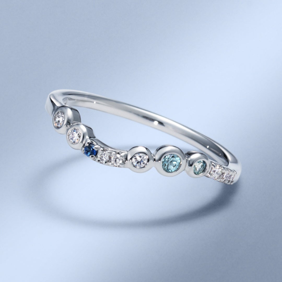 「明石の君」を表現したプレミアムジュエリー「Séravelle(セラヴェル)」は、彼女の持つ穏やかな気品と安らぎを、さざ波をモチーフに表現したリングです。古典で見られる水紋表現・流水紋を参照しながら、主体石にはブルーサファイアを用い、石留め技法や高低差など繊細なつくりにこだわりました。