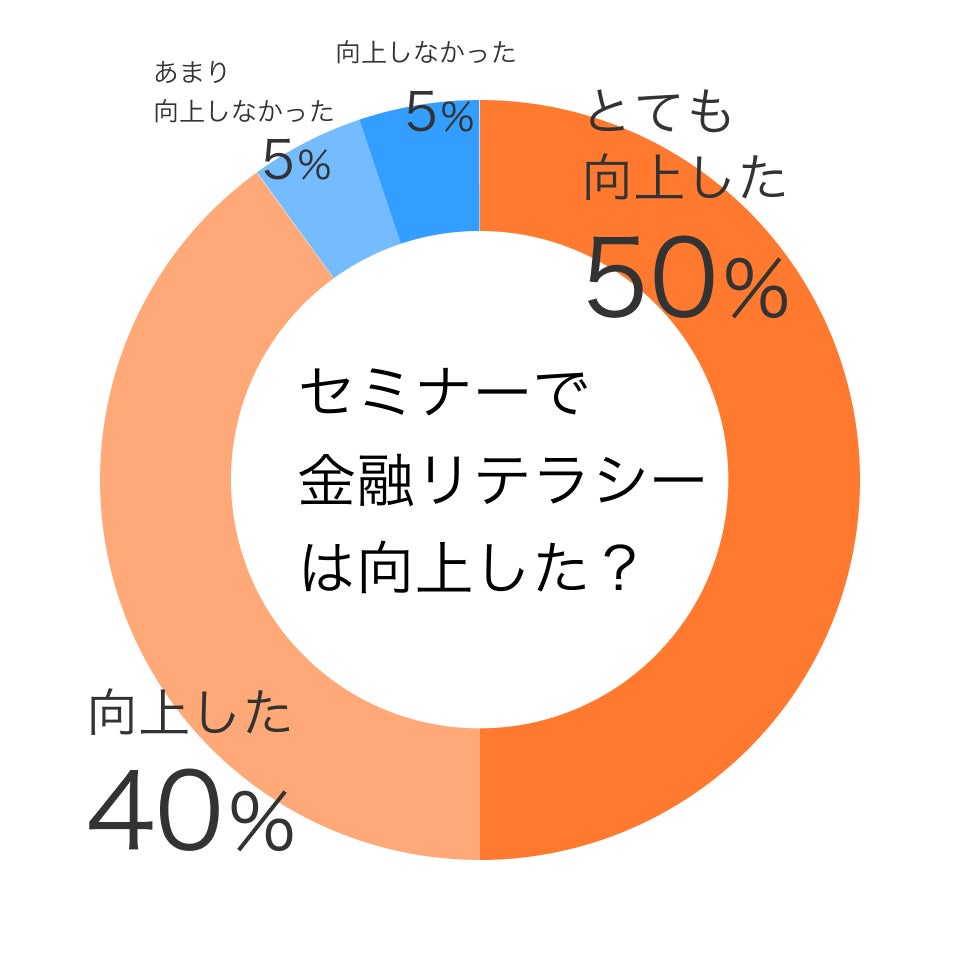 質問「セミナーを通して金融リテラシーは向上した?」についての回答割合は、「とても向上した」50%、「少し向上した」40%、計90%となりました。参加者にとって有益なセミナーであったことがうかがえました。
