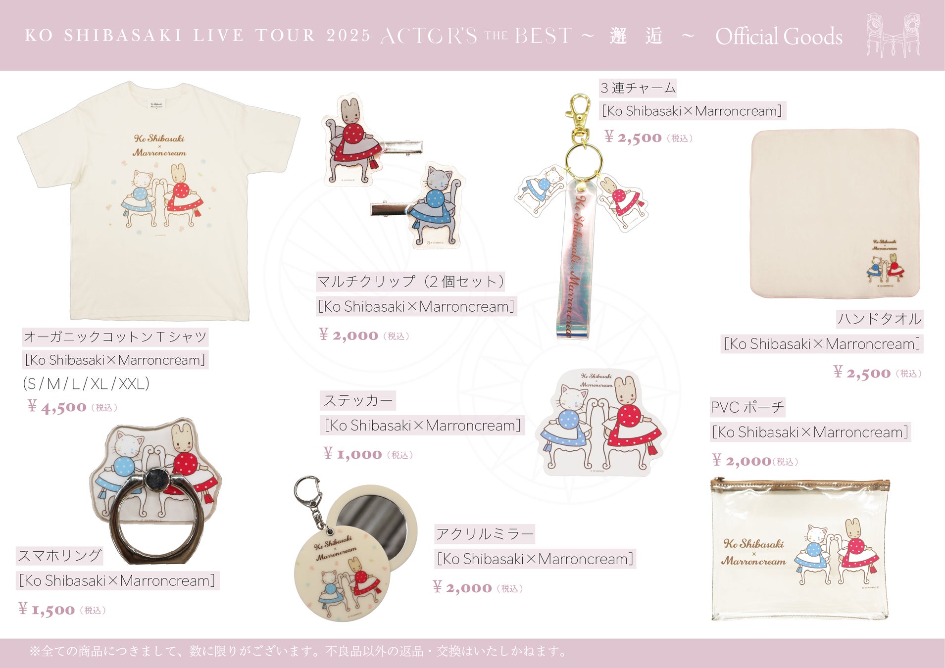 マロンクリームとのコラボグッズは、「KO SHIBASAKI LIVE TOUR 2025 ACTOR'S THE BEST 〜邂逅〜」ツアーグッズ第2弾として、全8アイテムを11月3日(月・祝)より販売いたします。