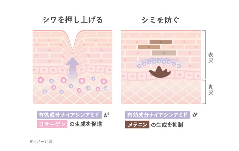 贅沢な美容液成分を凝縮し、大人の肌悩みをケア。シワ改善・美白*1有効成分ナイアシンアミドが角質層だけでなく表皮・真皮にまでアプローチ。コラーゲン生成を促進し、今あるシワを改善するとともにメラニンの生成を抑制。未来のシミもしっかり予防します。