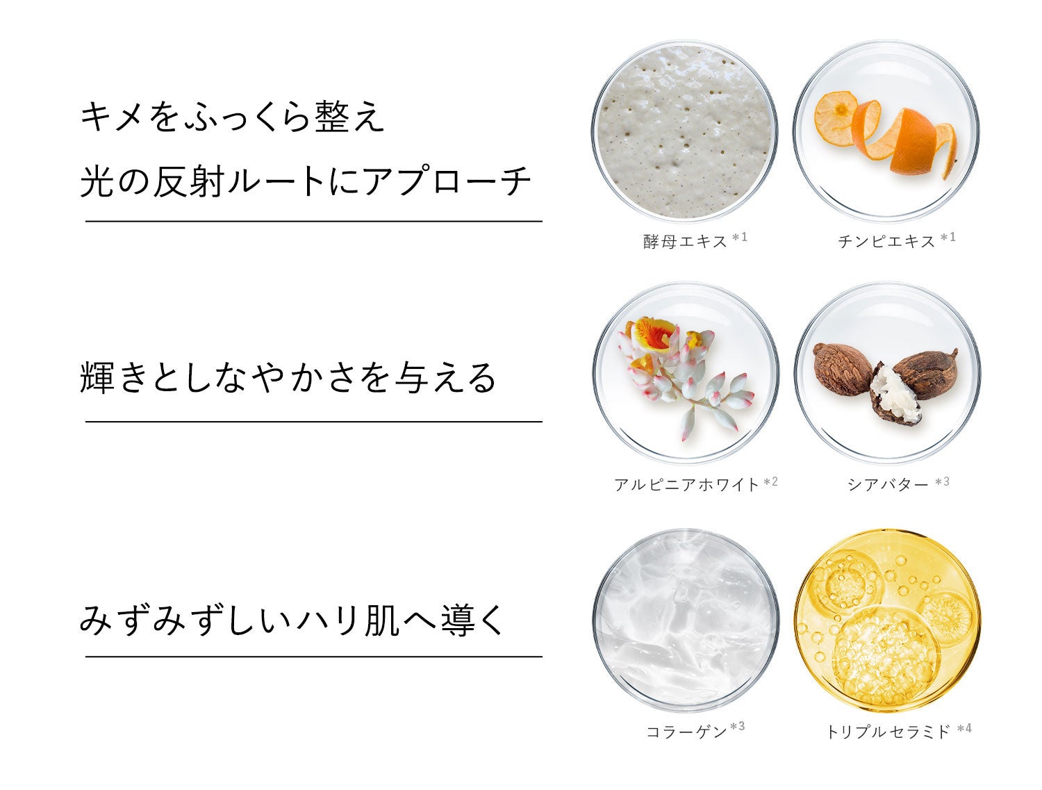 キメをふっくら整えて光の反射ルートにアプローチするYMクリア*1の他、アルピニアホワイト*2やシアバター*3など輝きとしなやかさを与える成分を配合。
