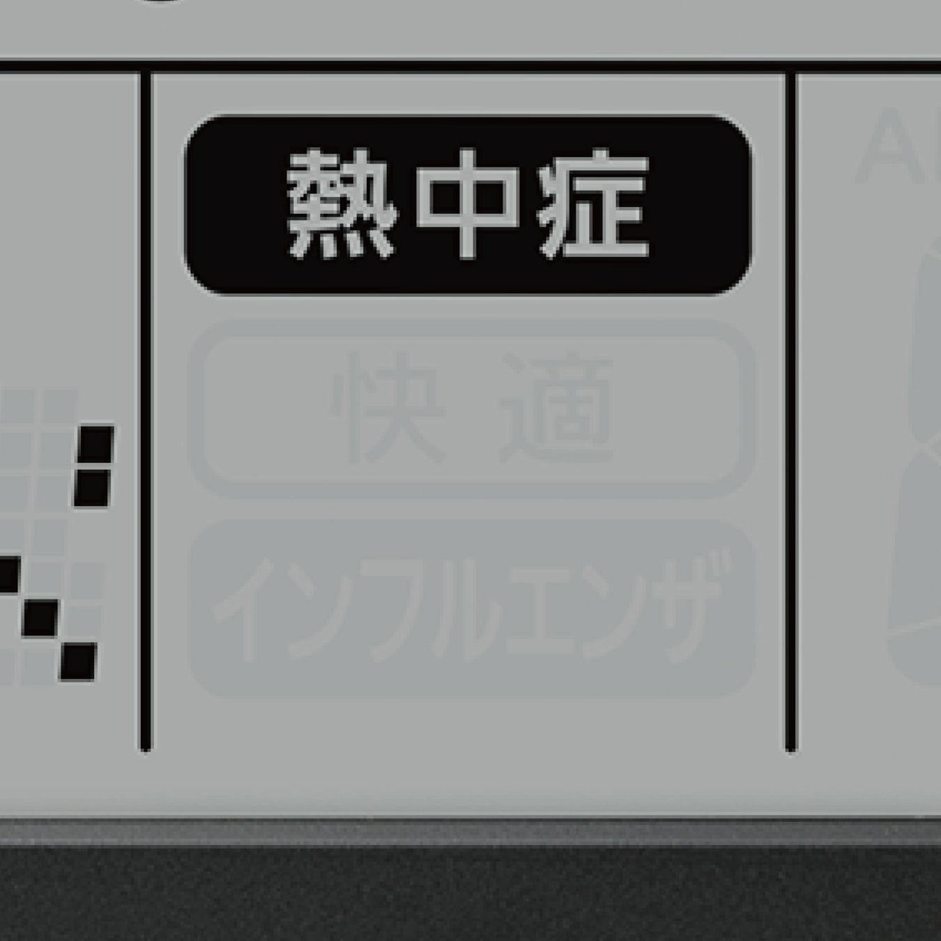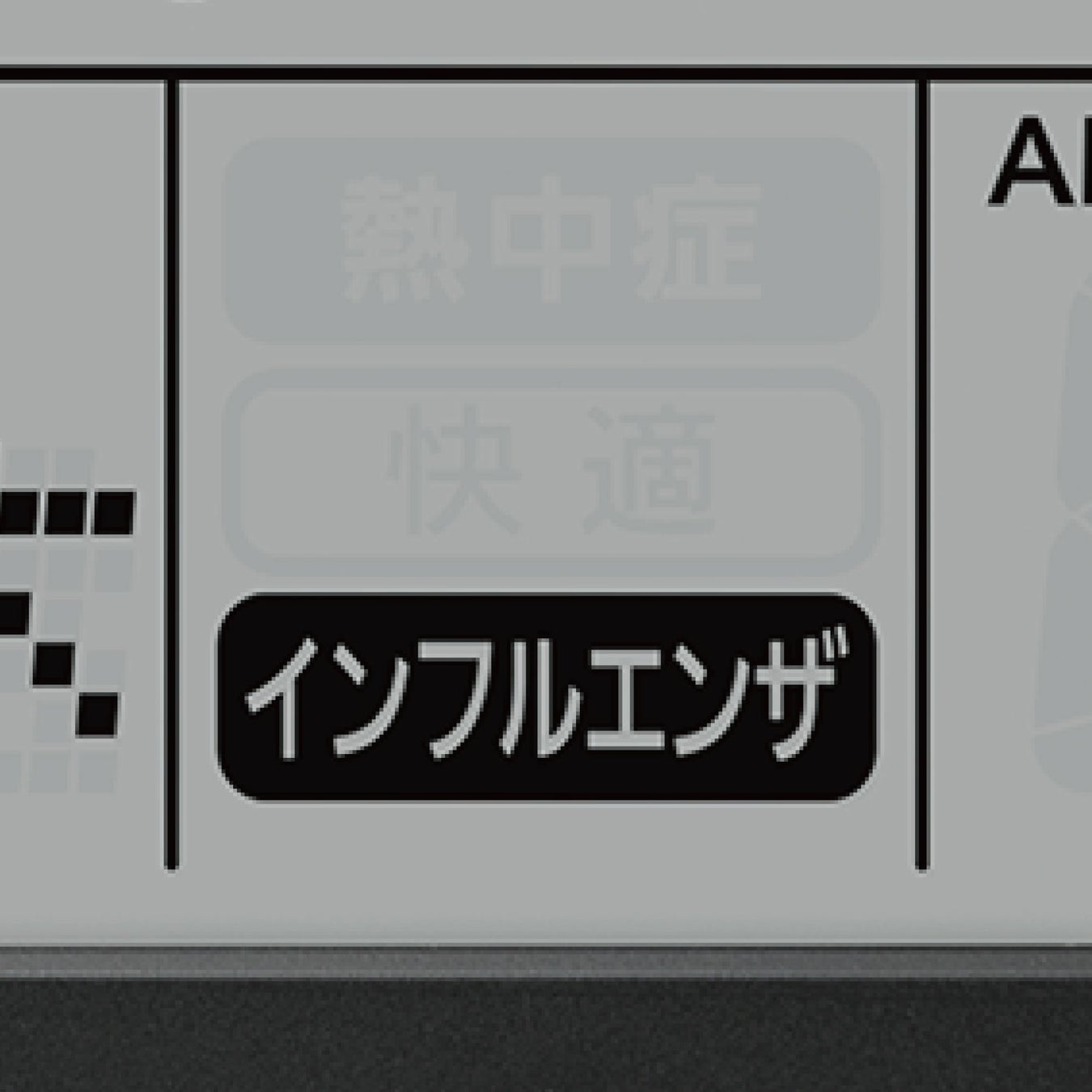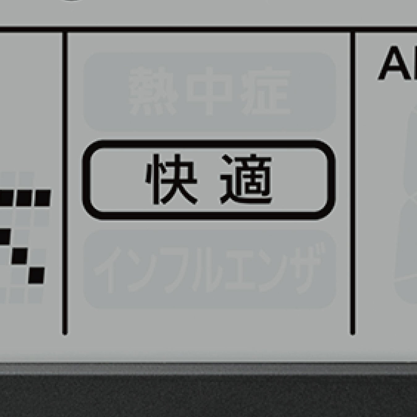 高精度センサーを搭載し、お部屋の環境目安をお知らせします。快適な場合は快適表示、熱中症やインフルエンザになりやすい温湿度の場合は点滅表示でお知らせします。