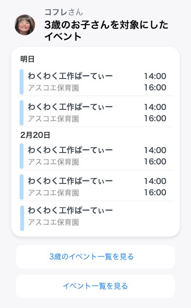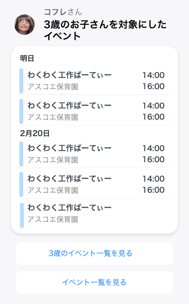 お子さんの年齢情報をもとに、お子さんが参加できる直近のイベントを表示します。