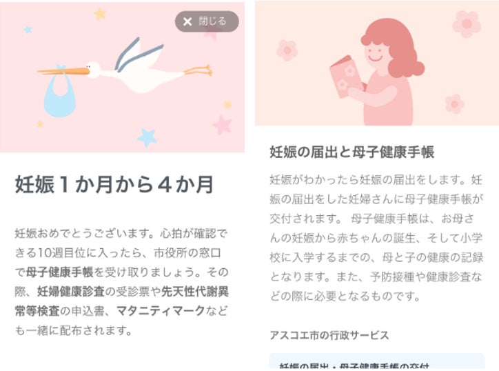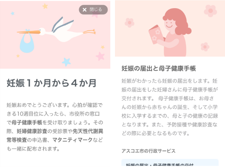 お子さんの年齢情報をもとに、年齢ごとの子育てガイドを表示します。子育てガイドでは、今利用できる行政サービスや、行政サービスに関するQ&Aなどの情報をわかりやすくまとめています。